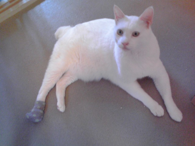 突然片足がデローンとなってしまった猫のマッコリ。 3日ほどはベッドから出てこなかったのが、やっと元気を取り戻したようだ。 粗相をしたカーペットは捨ててしまって、トイレの枠も浅いものと取り替えた。トイレの砂をけちらしても、その都度掃除をすればいいという気持ちで、まるで部屋全体がトイレの意気込みだったが、だんだんと散らす砂の量も少なくなった。 足が治ったわけではないが、歩き方に慣れたのだろうと思う。先生からは、引きずった際に、こすれて痛んでしまうことがあるので、予防に靴下を履かせることも提案されたので、100円ショップでテーブルの足のためのカバーを買って履かせる。写真のように、絵的にはとても笑えるのだが、当然すぐ脱いでしまう。 今のところ、なんとかうまく歩いているようなので、このまま猫も私も慣れていくだろうと思う。
