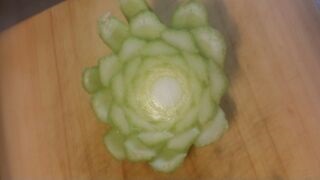 まだまだ野菜の高値が続く。 なんとか安い野菜はないか、とマーケットに行くと、おお、パパイヤが売っている。 パパイヤはソムタムを作るのに使う。タイの辛い辛いサラダで、タイの旅行中には毎日のように食べる。旅行仲間みんなの好物で、暑い昼下がりにこれをつまみながらビールを飲むのは最高だ。ただ、パパイヤは日本では結構高いのでオソルオソル購入したりしなかったり。これが半額。やはり買う人が少ないせいか。 目を転じると、ハヤトウリという瓜が並んでいる。こちらもなじみがない野菜で、ただのような値札が付いている。「うりうりがうりうりにきてうりうりのこし・・・」などと思いながら、これも有難く購入。糠漬けや炒めものにするつもりだ。 続いての野菜はズイキ。乾燥した芋がらの方がポピュラーかも。初めて食べた時のことをよく覚えている。どこかの温泉場の、掘立小屋のような居酒屋で、お通しとしておばあちゃんが出してくれた。ナスの煮物にしては歯ごたえがある。これをズイキだと知ったのは、それから何年も後のことだ。 さらに買ったのが、ターツァイ。中国の野菜で、濃い緑の葉が中心に向かって、だんだんに小ぶりになってゆくが、その形がまるでマトリョーシカのように揃っているところが美しく、調理しながらつい見とれてしまう野菜。 いつもと違って珍しい野菜が並ぶのを、この際楽しんでしまおうという意気込み。写真は、ターツァイの芯のところ。自然の美ですなぁ。